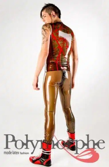 Beautifully styled tuxedo jacket with a latex twist. Adorned with decorative buttons, faux martingale belt and rear slit. Heavy-weight striped latex.